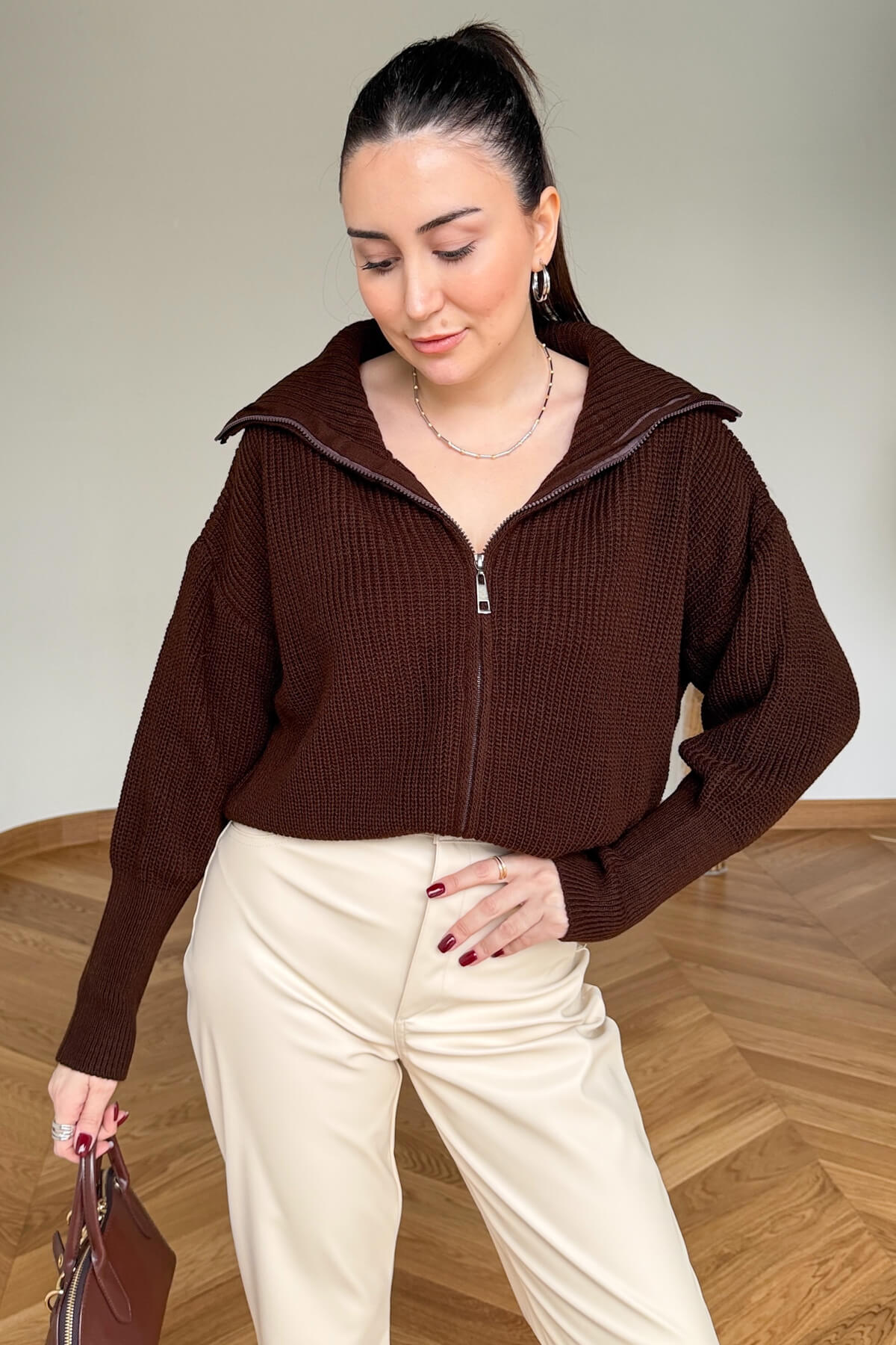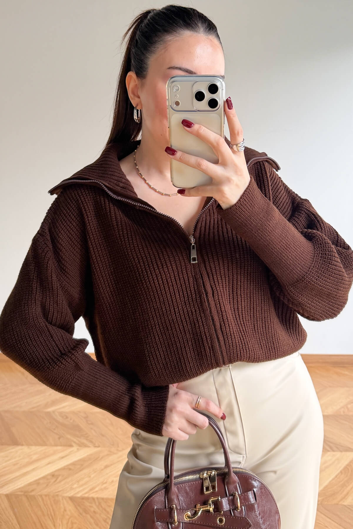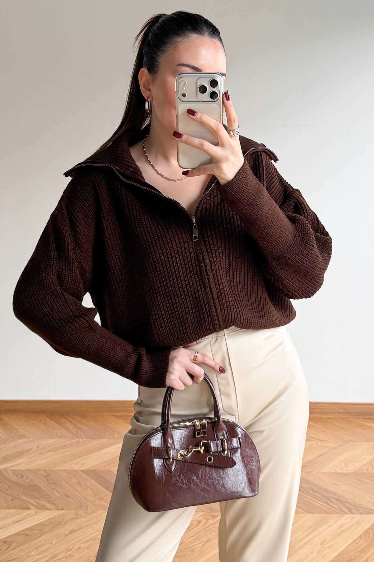 Selanik örme tekniğinin sunduğu tok ve kaliteli duruşu, modern sokak stiliyle buluşturan bu siyah hırka, serin havaların vazgeçilmezi olmaya aday. 55 cm'lik ideal bel hizası boyu ve metal fermuar detayı, tasarıma sportif bir şıklık katıyor. Fermuarını tamamen kapatarak dik yaka formunda veya yarım açarak geniş yaka stiliyle kullanabileceğiniz bu parça, esnek yapısı sayesinde gün boyu konfor sunuyor. Minimalist tasarımıyla her kombine uyum sağlayan anahtar bir parçadır.