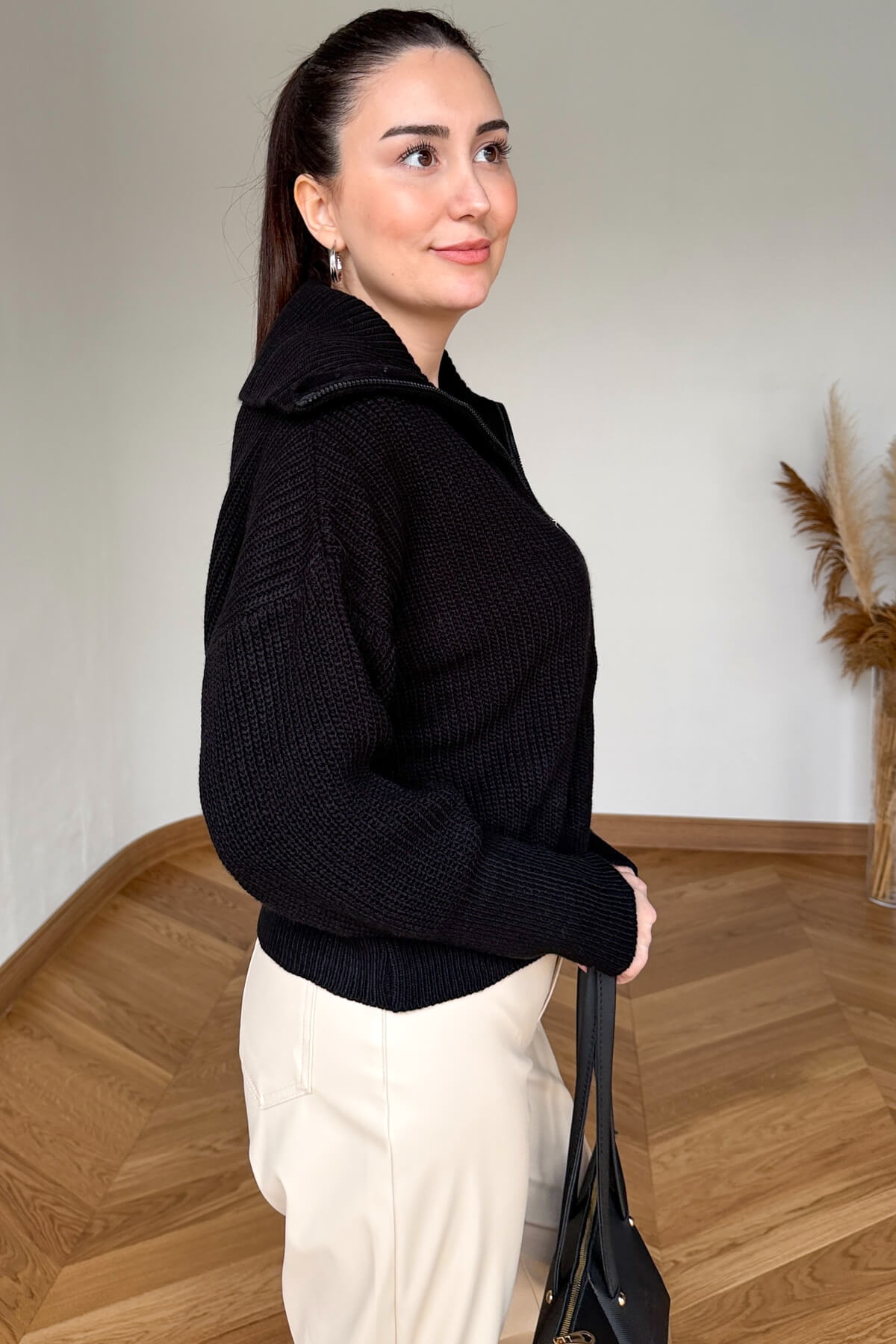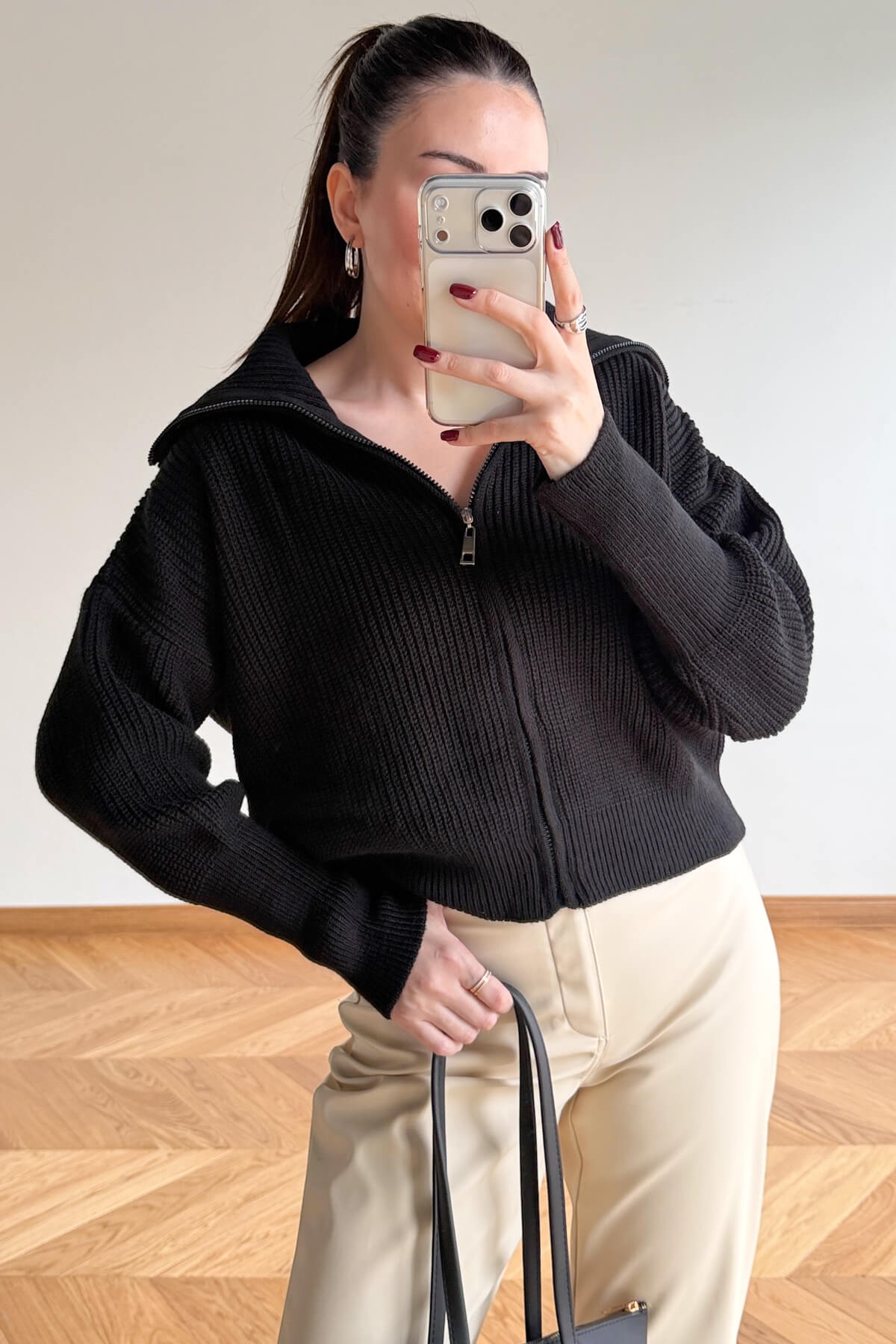 Selanik örme tekniğinin sunduğu tok ve kaliteli duruşu, modern sokak stiliyle buluşturan bu siyah hırka, serin havaların vazgeçilmezi olmaya aday. 55 cm'lik ideal bel hizası boyu ve metal fermuar detayı, tasarıma sportif bir şıklık katıyor. Fermuarını tamamen kapatarak dik yaka formunda veya yarım açarak geniş yaka stiliyle kullanabileceğiniz bu parça, esnek yapısı sayesinde gün boyu konfor sunuyor. Minimalist tasarımıyla her kombine uyum sağlayan anahtar bir parçadır.
