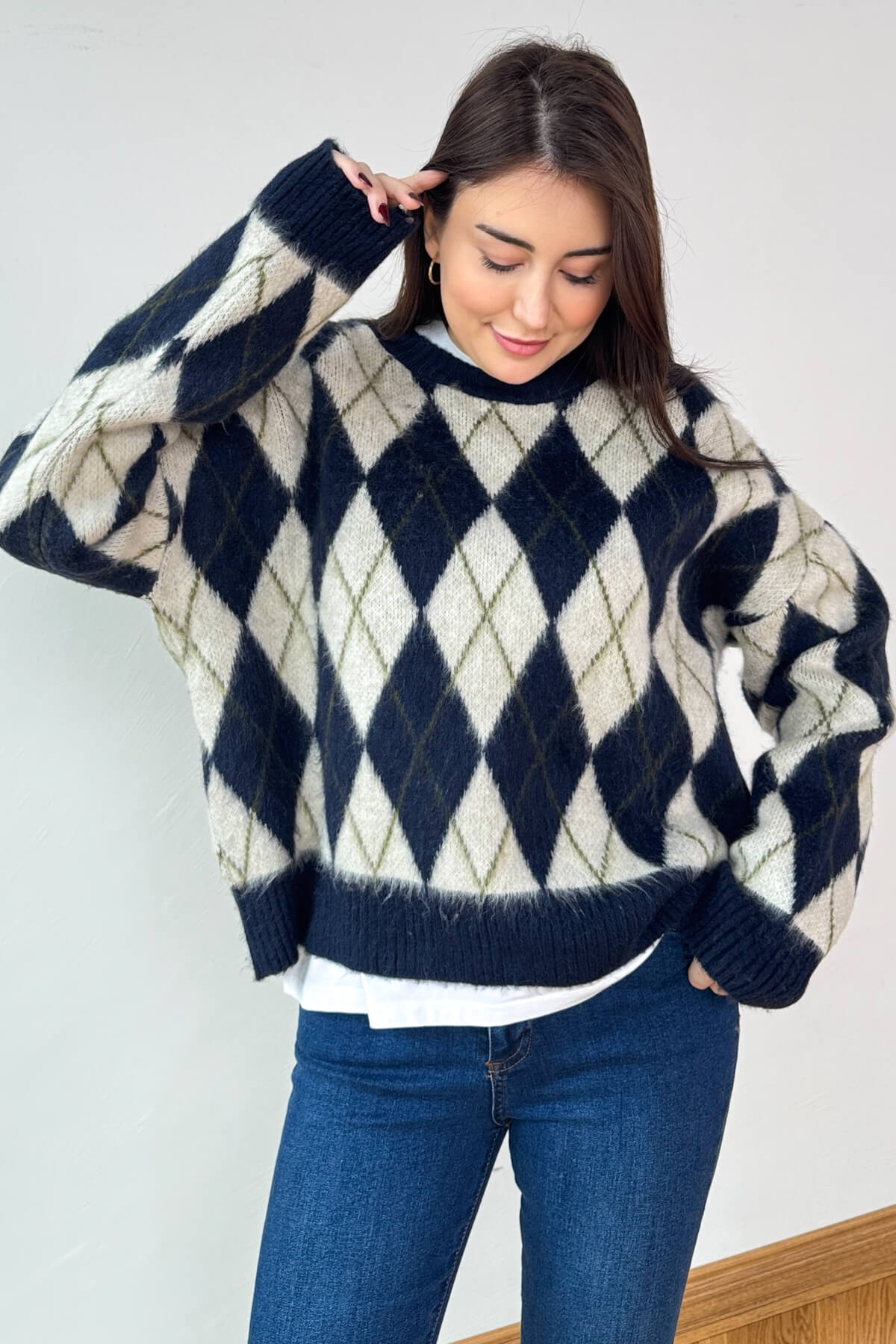 TRK-6223 Lacivert Baklava Desen Çift Katmanlı Kışlık Triko Kazak
