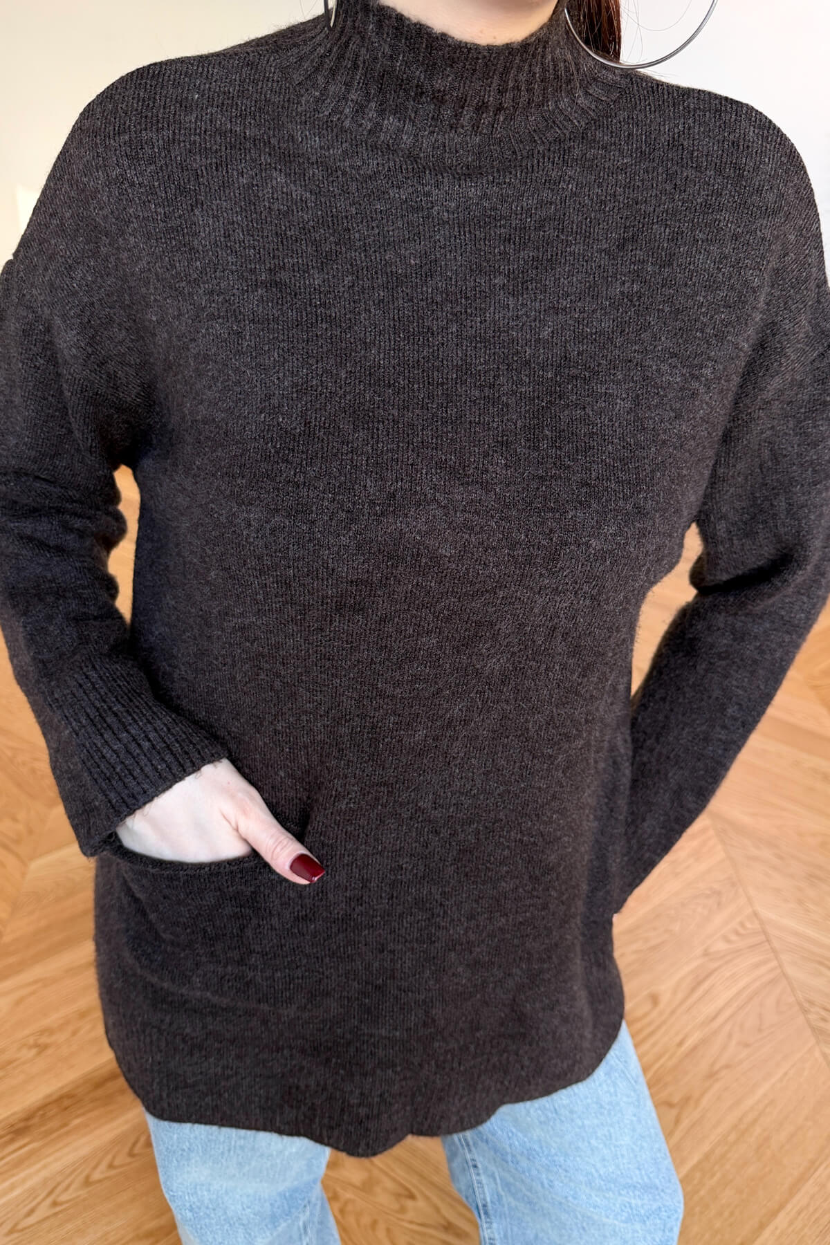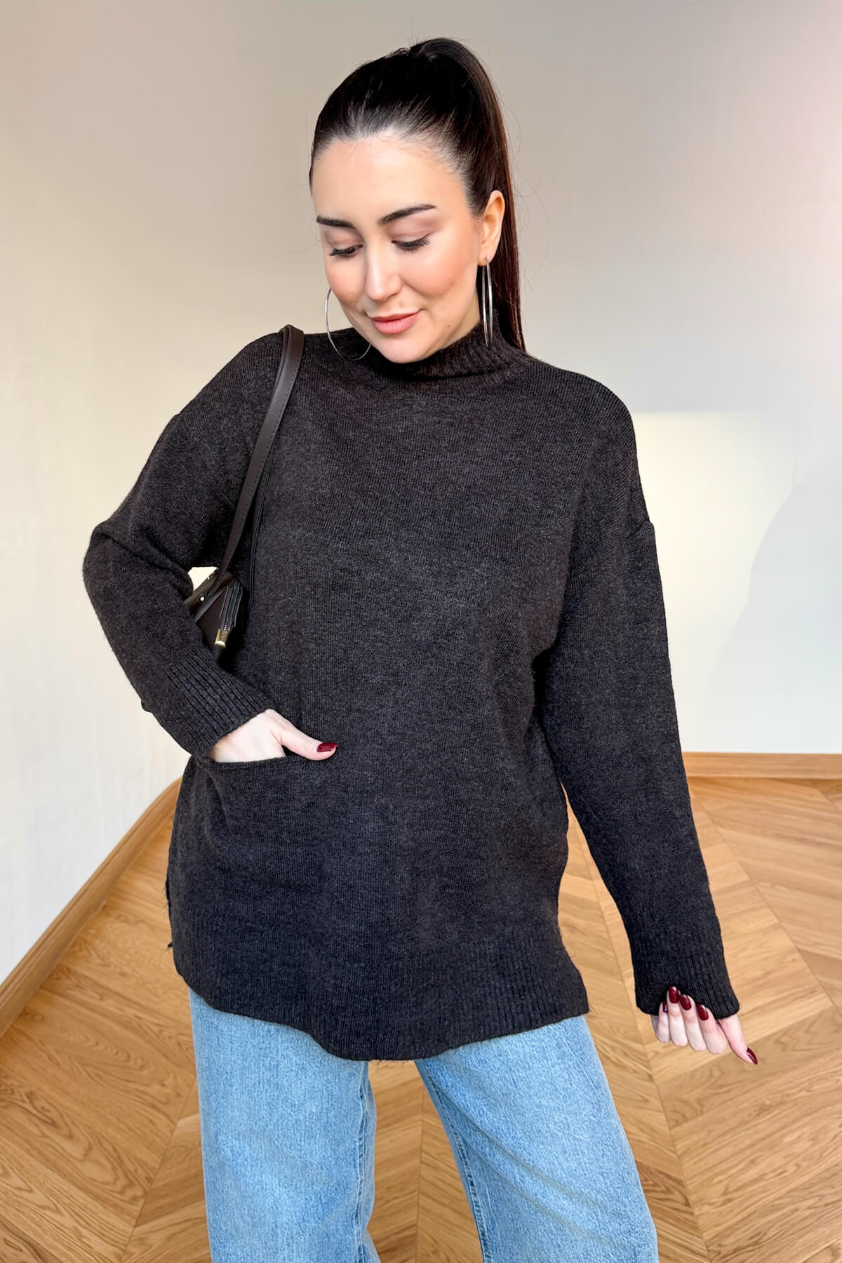 Kış gardırobunuza enerji ve sıcaklık katacak bu tasarım kazak, %100 pamuklu doğal ipliği sayesinde cildinizin nefes almasını sağlarken gün boyu süren üstün bir konfor sunar. Yumuşak dokusu teninizde lüks bir his bırakırken, modern yarım balıkçı yaka kesimi soğuk havalarda sizi şıklıkla sarmalar. Tasarımın ön yüzündeki minimal cep detayı, klasik triko görünümüne çağdaş ve sportif bir dokunuş ekliyor. 68 cm ideal boyu ve 60 cm genişliğindeki rahat kalıbı ile hem şık hem de eforsuz bir stil arayanlar için vazgeçilmez bir parça.