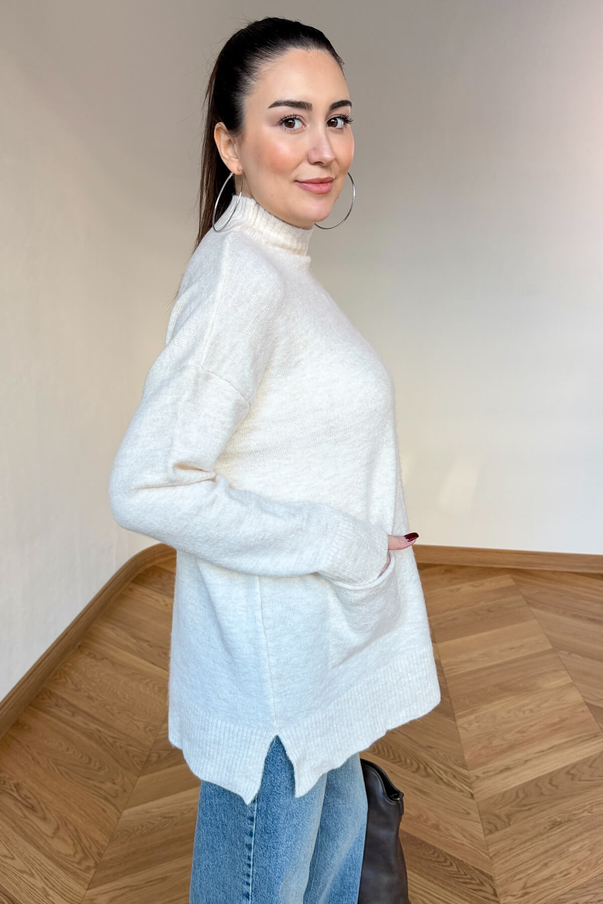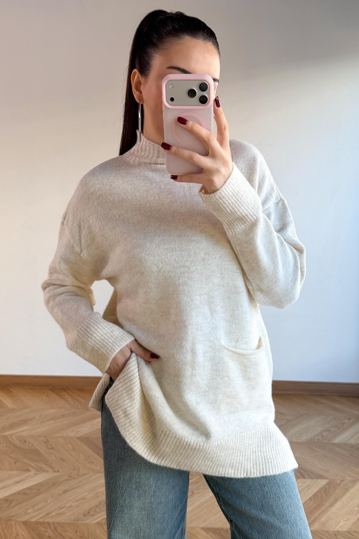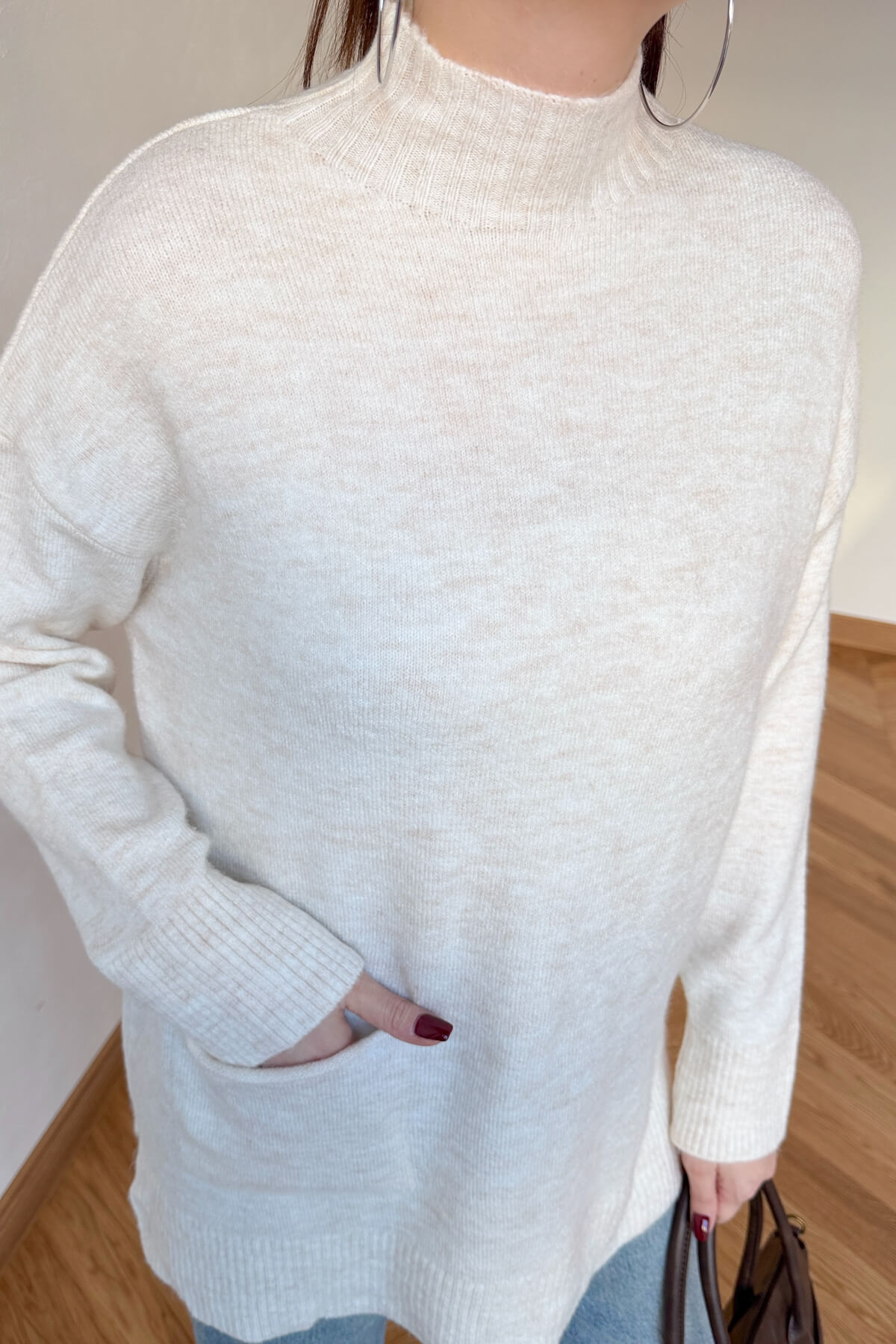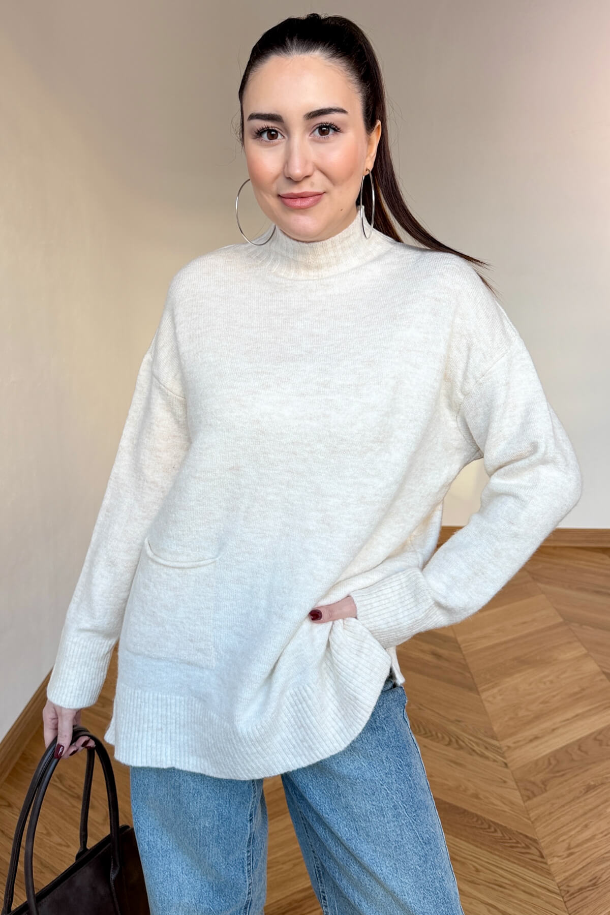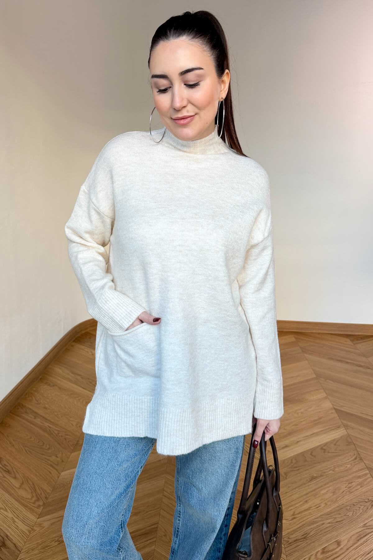 Kış gardırobunuza enerji ve sıcaklık katacak bu tasarım kazak, %100 pamuklu doğal ipliği sayesinde cildinizin nefes almasını sağlarken gün boyu süren üstün bir konfor sunar. Yumuşak dokusu teninizde lüks bir his bırakırken, modern yarım balıkçı yaka kesimi soğuk havalarda sizi şıklıkla sarmalar. Tasarımın ön yüzündeki minimal cep detayı, klasik triko görünümüne çağdaş ve sportif bir dokunuş ekliyor. 68 cm ideal boyu ve 60 cm genişliğindeki rahat kalıbı ile hem şık hem de eforsuz bir stil arayanlar için vazgeçilmez bir parça.