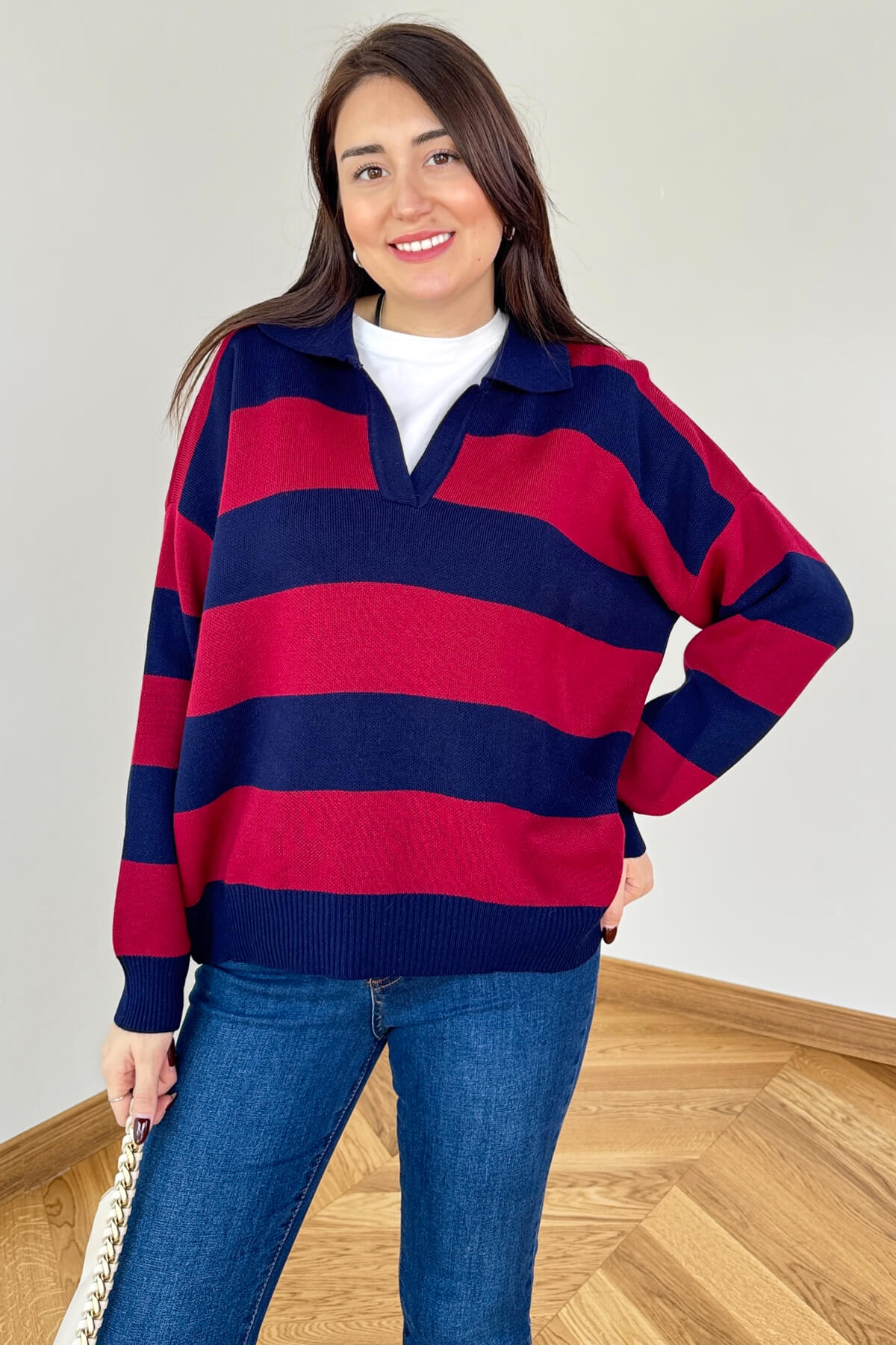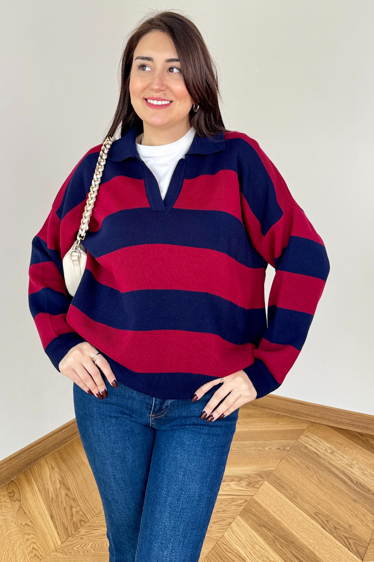 Polo yaka ve V kesim detayı, sportif bir şıklık kazandırır.