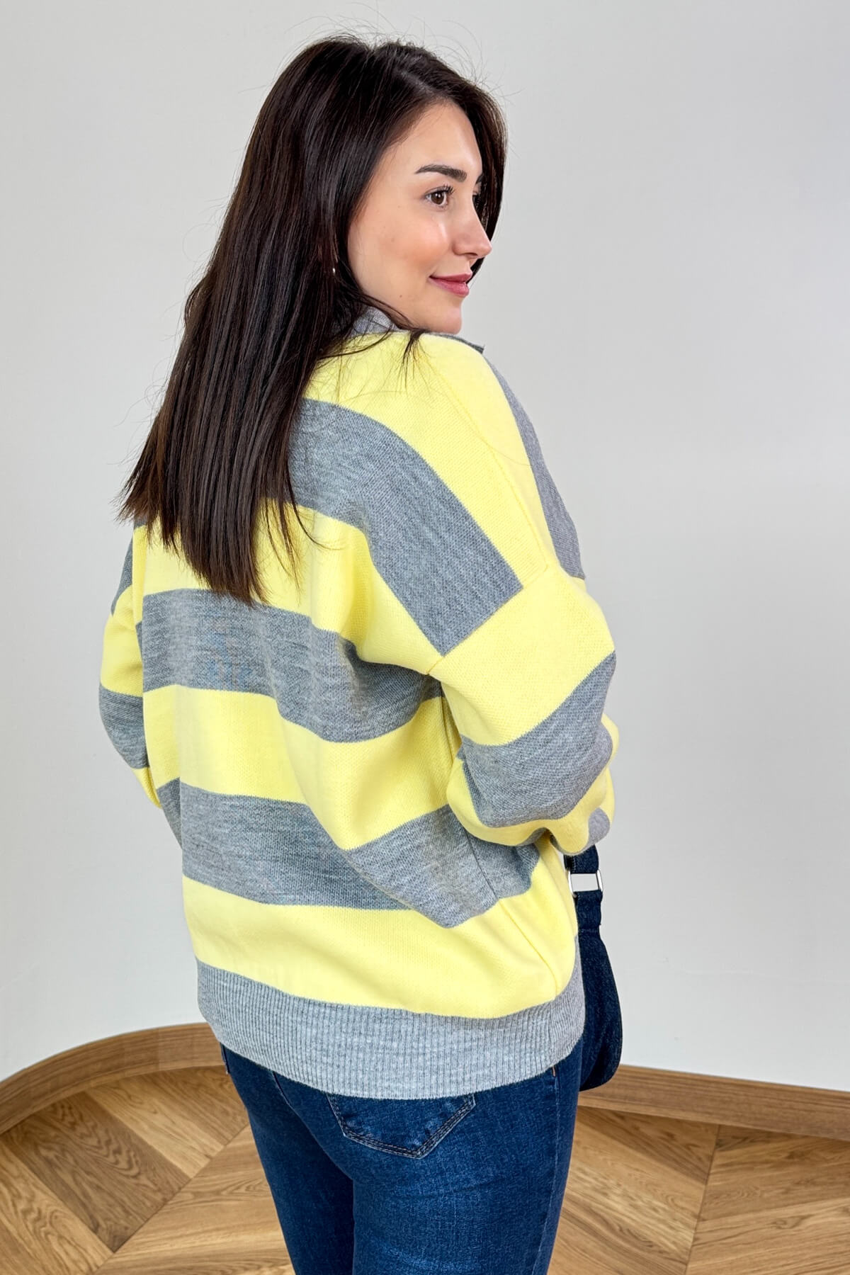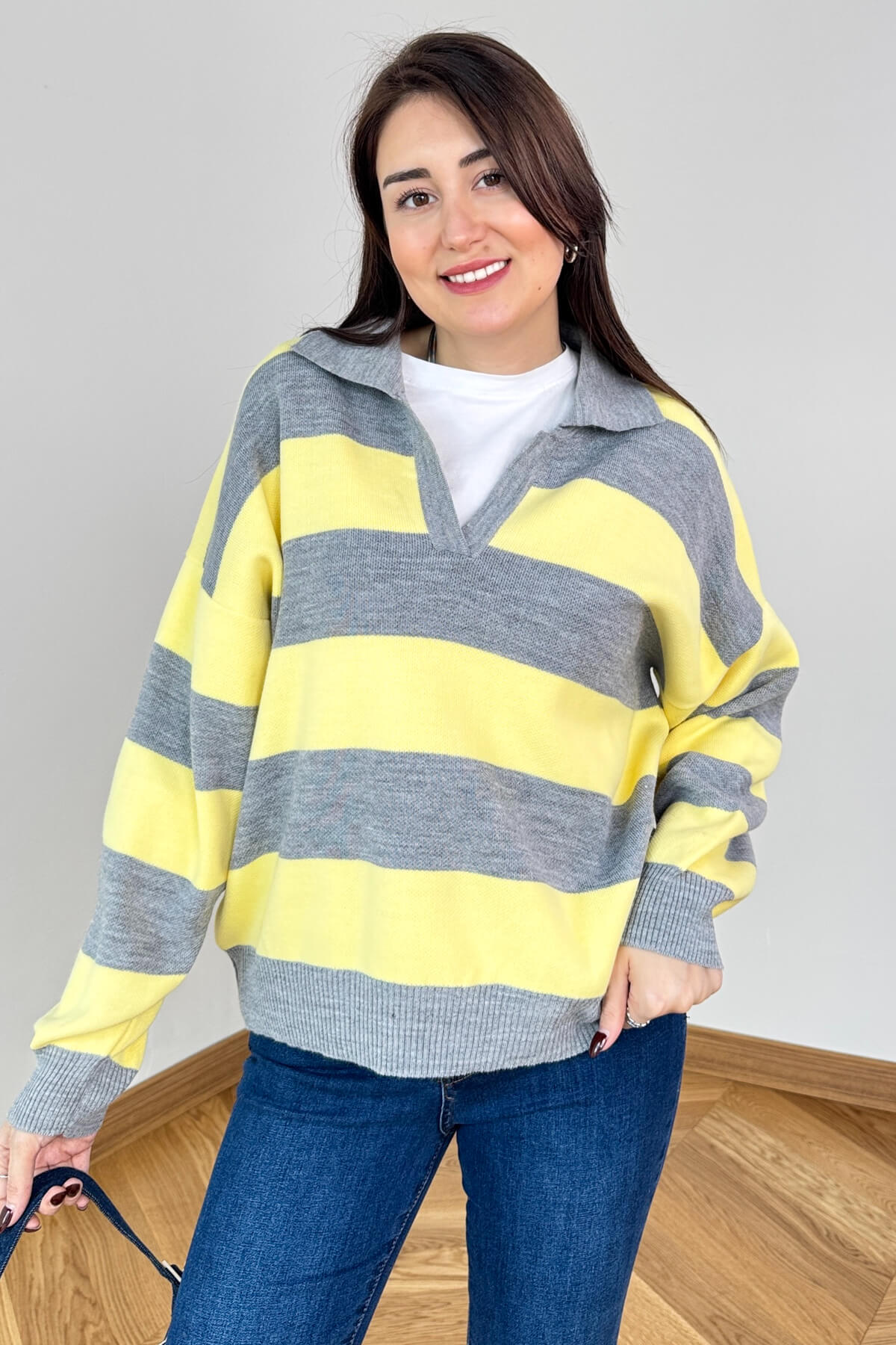 Polo yaka ve V kesim detayı, sportif bir şıklık kazandırır.