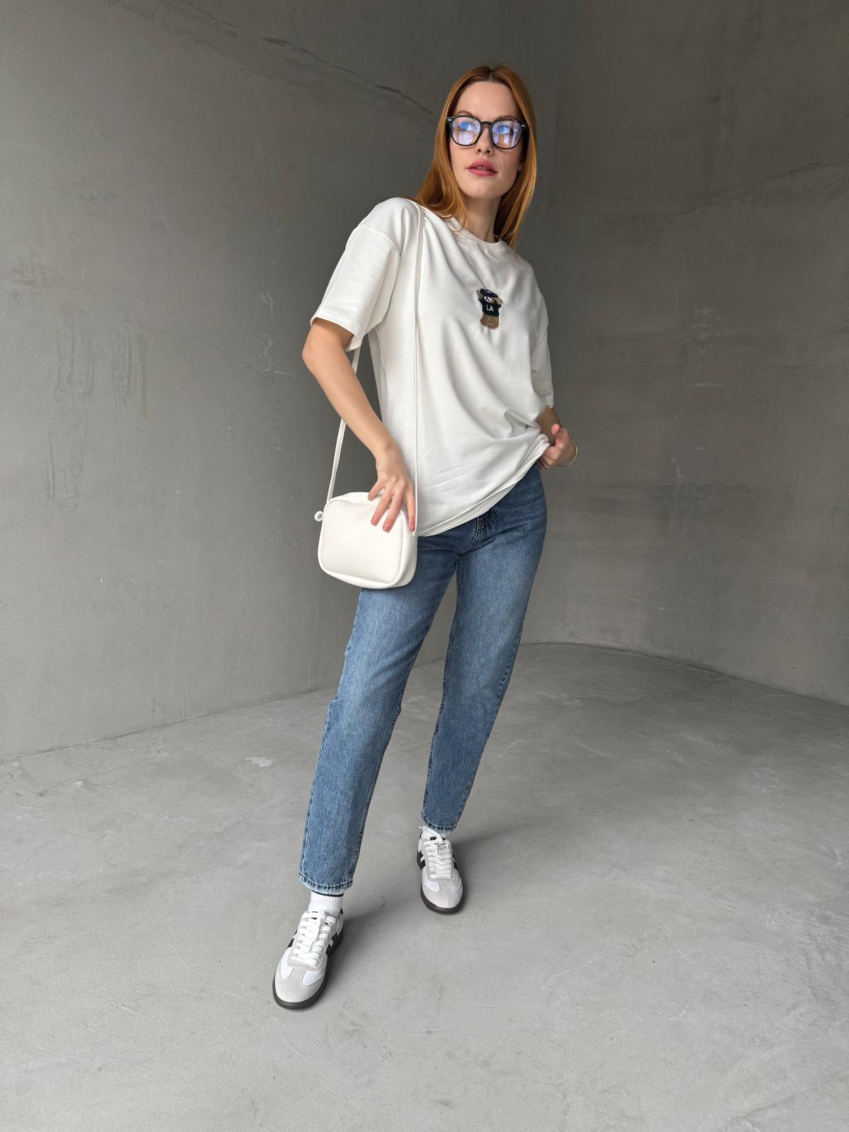 TSR-04353 Beyaz Bisiklet Yaka Teddy Bear Nakışlı Tişört