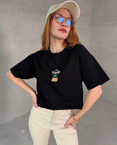 TSR-04353 Siyah Bisiklet Yaka Teddy Bear Nakışlı Tişört