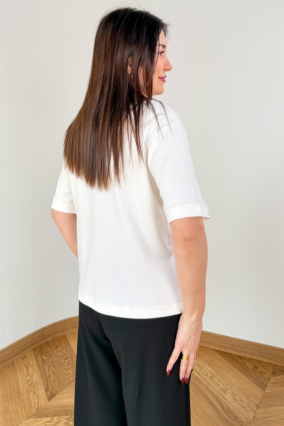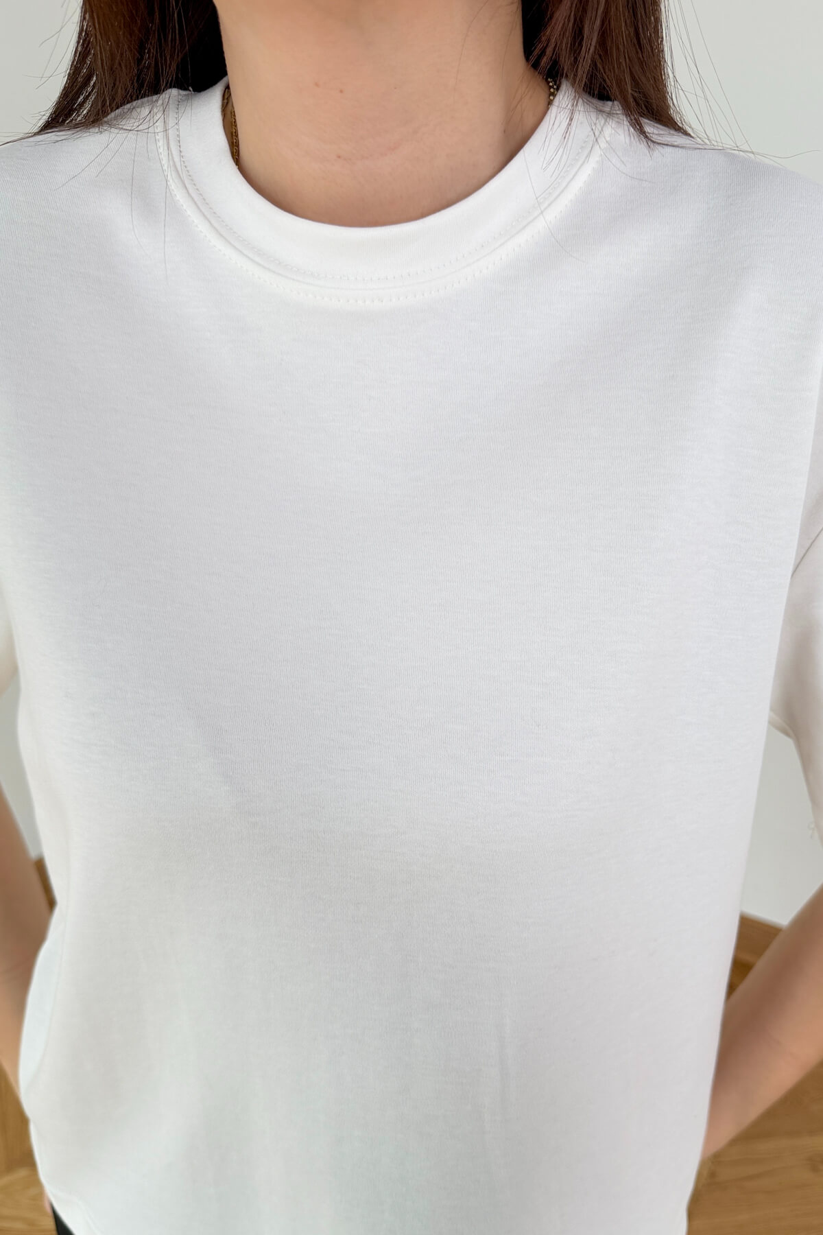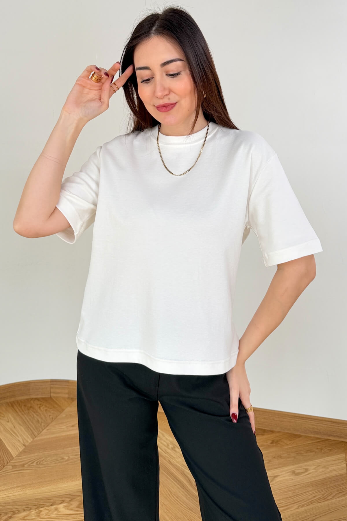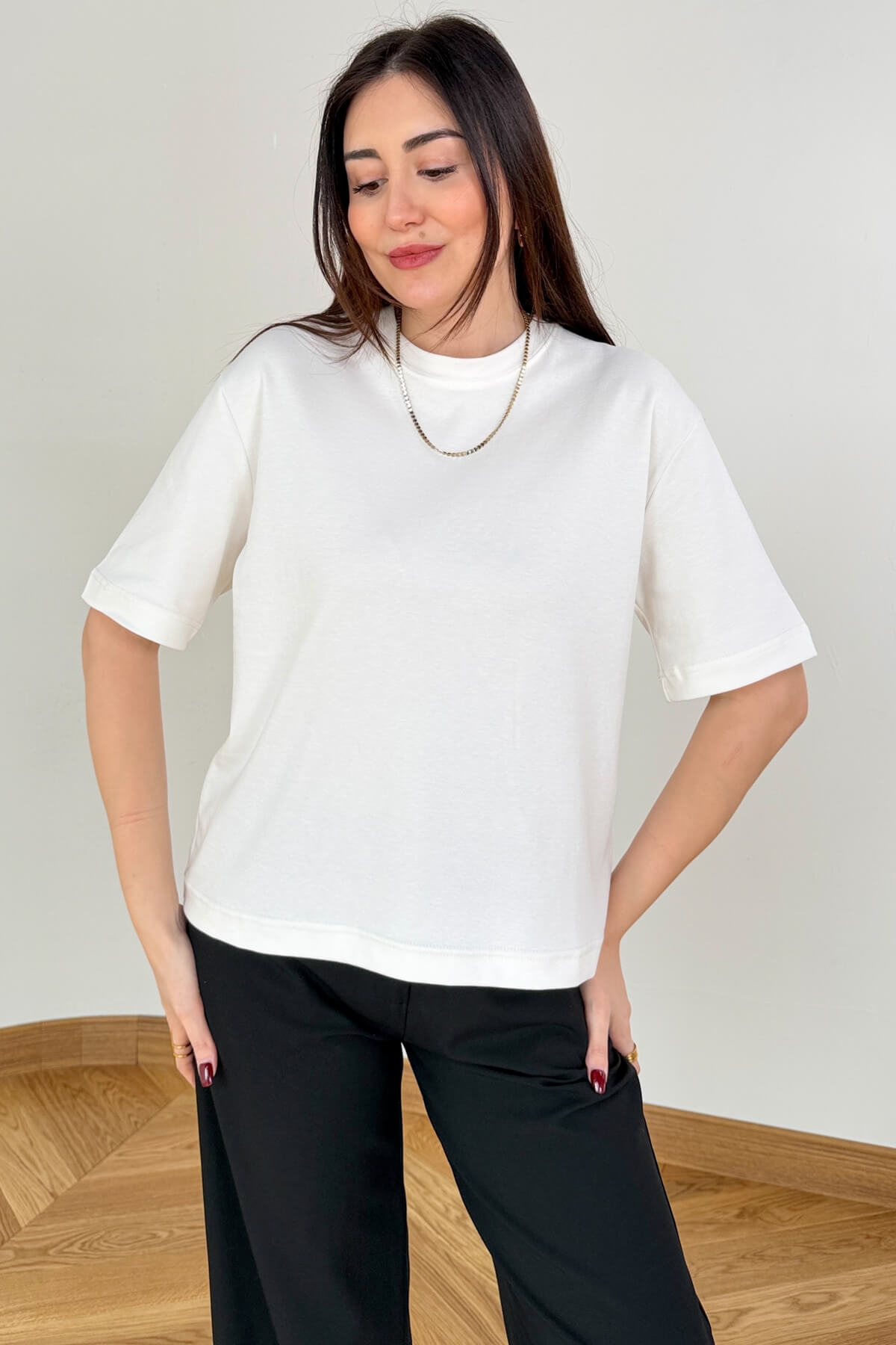 Sürdürülebilir moda anlayışını üstün kaliteyle birleştiren bu basic tişört, %100 organik pamuk içeriğiyle cildinize nefes aldırır. Sıradan tişörtlerin aksine, yaka kısmında kullanılan özel kanal dikiş ve çift dikiş teknolojisi sayesinde yıkamalara karşı ekstra dirençlidir; yaka formunu asla kaybetmez ve sarkma yapmaz. "Tok duruşlu" premium kumaşı, vücut hatlarını kusursuz gösterirken gün boyu süren bir konfor sunar. Siyah, toz pembe, mor, mürdüm, lacivert, ekru ve kahverengi renk seçenekleriyle uzun yıllar giyebileceğiniz bir yatırım parçasıdır.