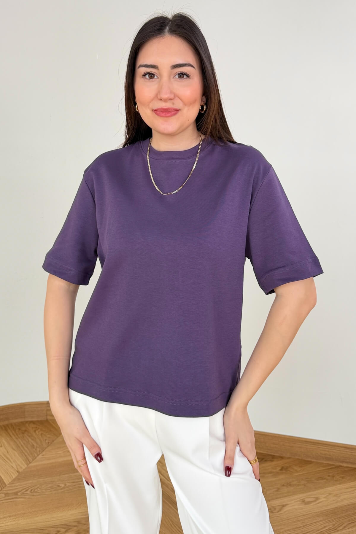 Sürdürülebilir moda anlayışını üstün kaliteyle birleştiren bu basic tişört, %100 organik pamuk içeriğiyle cildinize nefes aldırır. Sıradan tişörtlerin aksine, yaka kısmında kullanılan özel kanal dikiş ve çift dikiş teknolojisi sayesinde yıkamalara karşı ekstra dirençlidir; yaka formunu asla kaybetmez ve sarkma yapmaz. "Tok duruşlu" premium kumaşı, vücut hatlarını kusursuz gösterirken gün boyu süren bir konfor sunar. Siyah, toz pembe, mor, mürdüm, lacivert, ekru ve kahverengi renk seçenekleriyle uzun yıllar giyebileceğiniz bir yatırım parçasıdır.