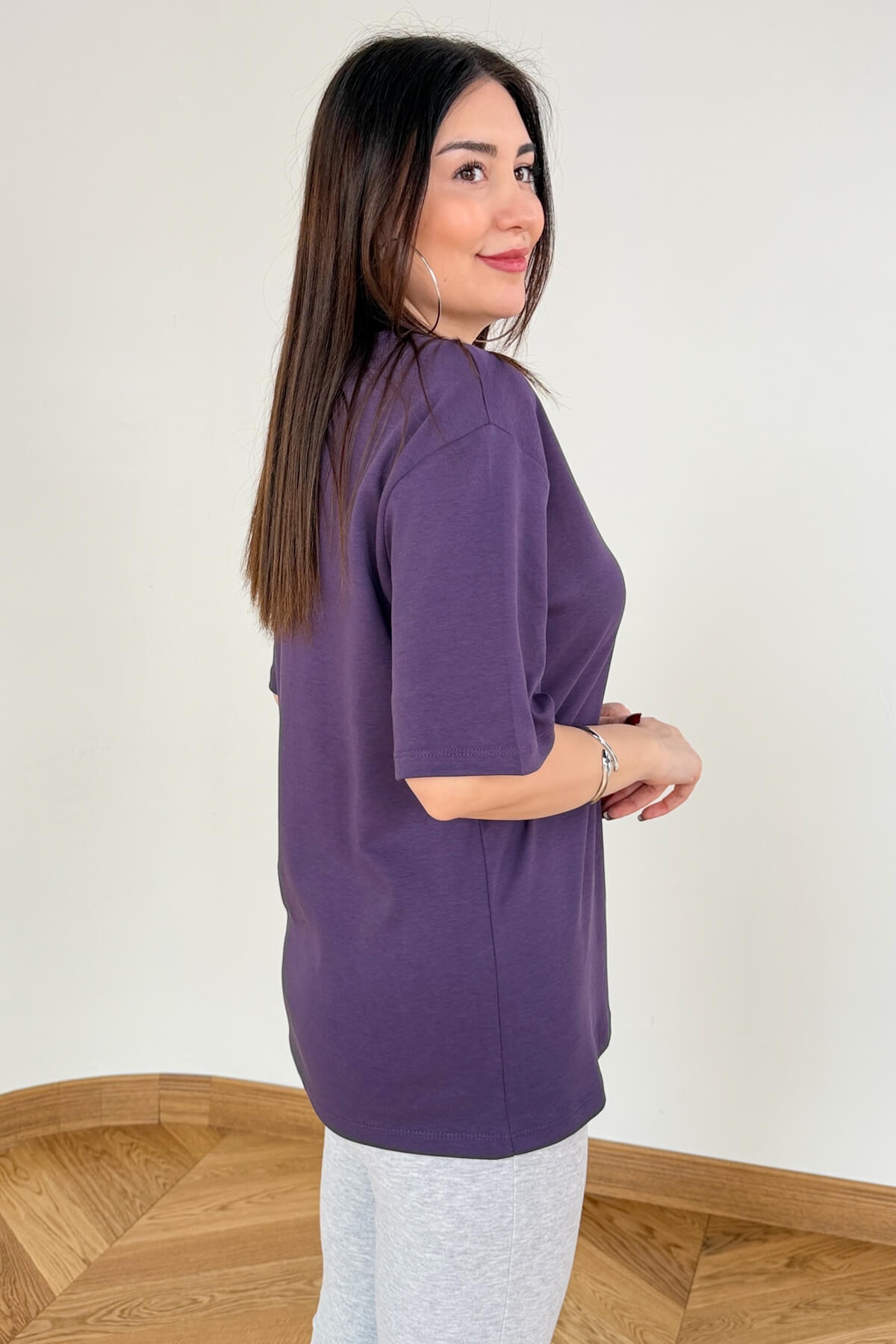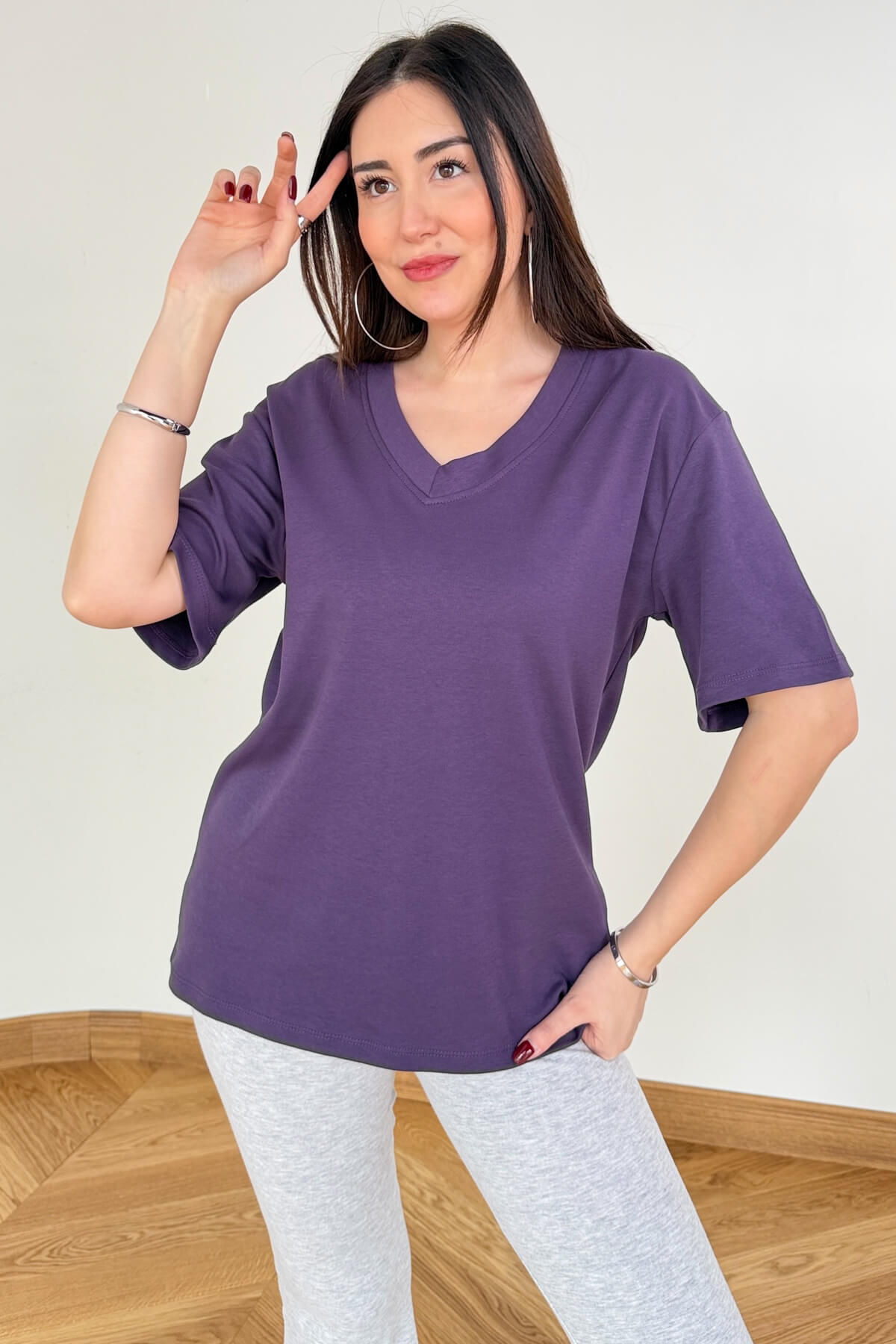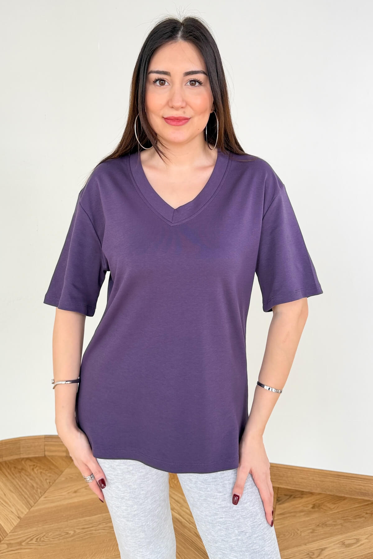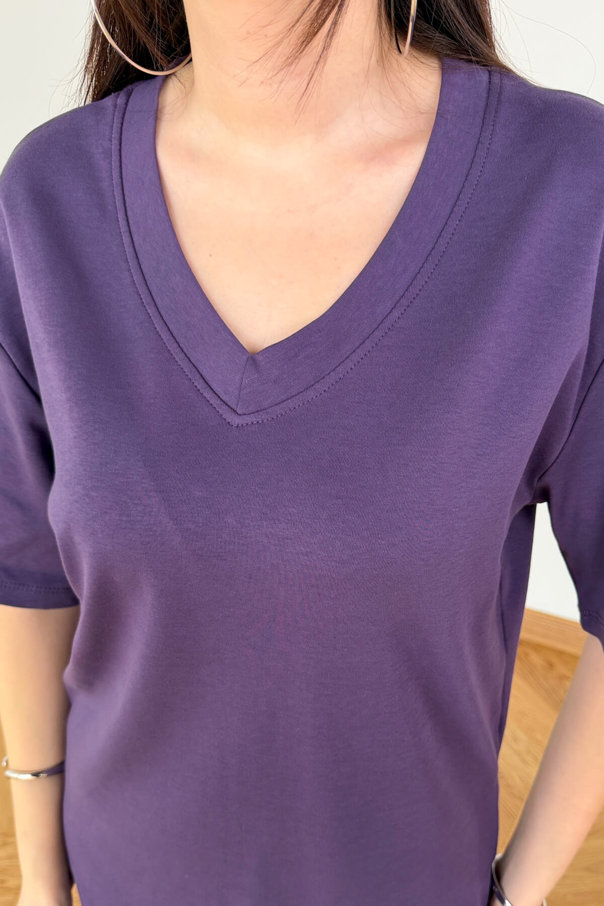 Doğallığı ve zarafeti buluşturan bu V yaka tişört, %100 organik pamuk dokusuyla teninize hassas bir dokunuş yapar. 64 cm'lik ideal boyu sayesinde ister pantolon içine sokarak ister dışarıda bırakarak kullanabilirsiniz. V yaka hattındaki çift dikiş ve güçlendirilmiş kanal dikiş detayları, dekolte bölgesinin formunun bozulmasını ve marullanmasını engeller. Tok duruşu ve pürüzsüz yüzeyiyle kaliteyi ilk dokunuşta hissettiren bu parça; siyah, toz pembe, mor, mürdüm, lacivert, ekru ve kahverengi renkleriyle gardırobunuzun demirbaşı olacak.