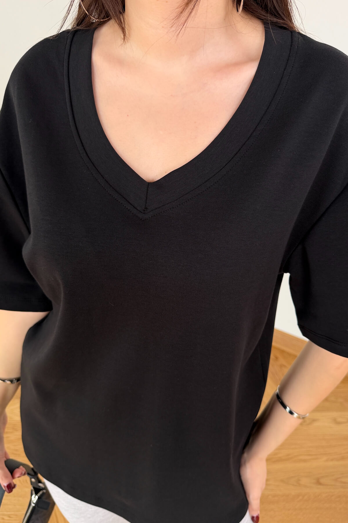 Doğallığı ve zarafeti buluşturan bu V yaka tişört, %100 organik pamuk dokusuyla teninize hassas bir dokunuş yapar. 64 cm'lik ideal boyu sayesinde ister pantolon içine sokarak ister dışarıda bırakarak kullanabilirsiniz. V yaka hattındaki çift dikiş ve güçlendirilmiş kanal dikiş detayları, dekolte bölgesinin formunun bozulmasını ve marullanmasını engeller. Tok duruşu ve pürüzsüz yüzeyiyle kaliteyi ilk dokunuşta hissettiren bu parça; siyah, toz pembe, mor, mürdüm, lacivert, ekru ve kahverengi renkleriyle gardırobunuzun demirbaşı olacak.