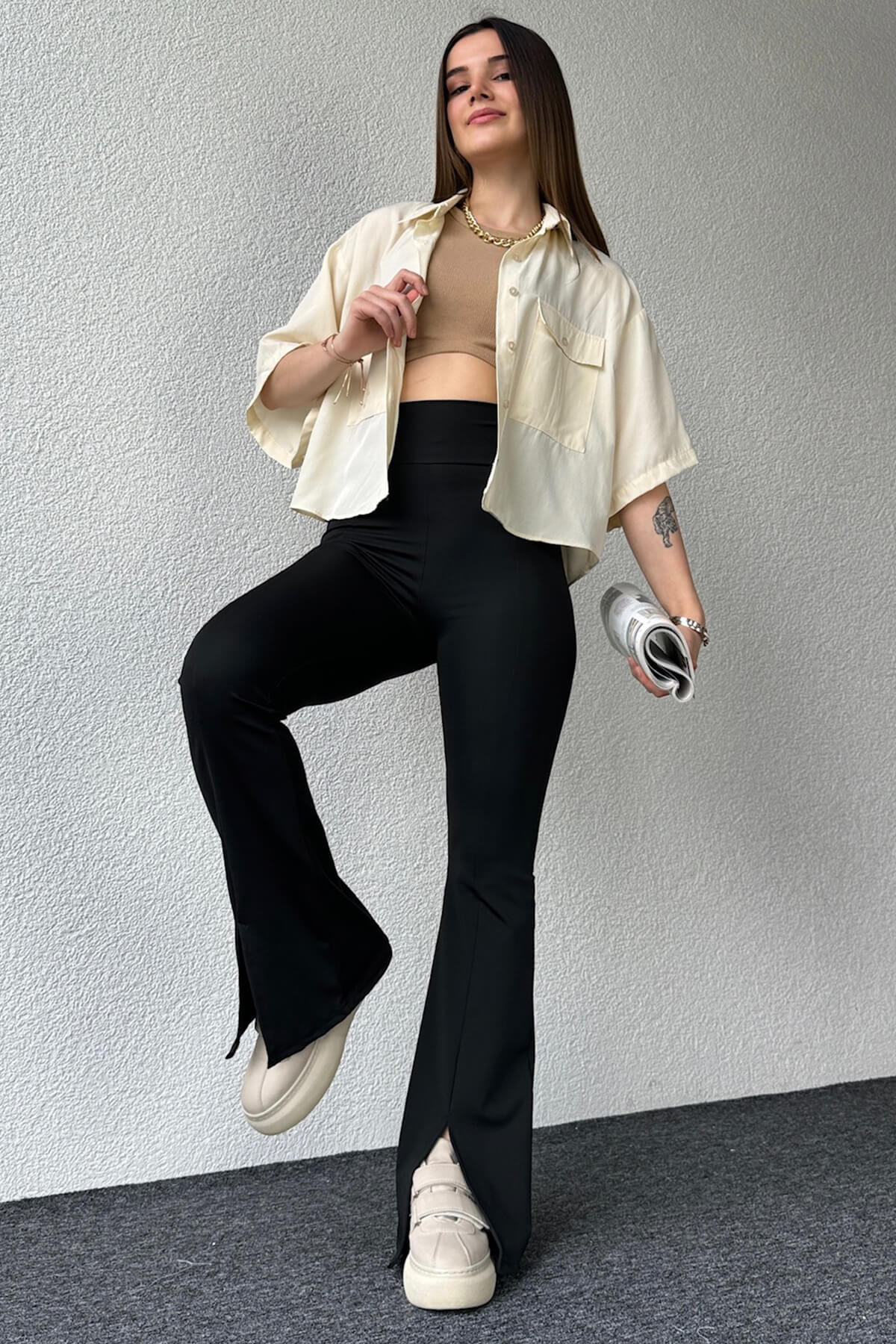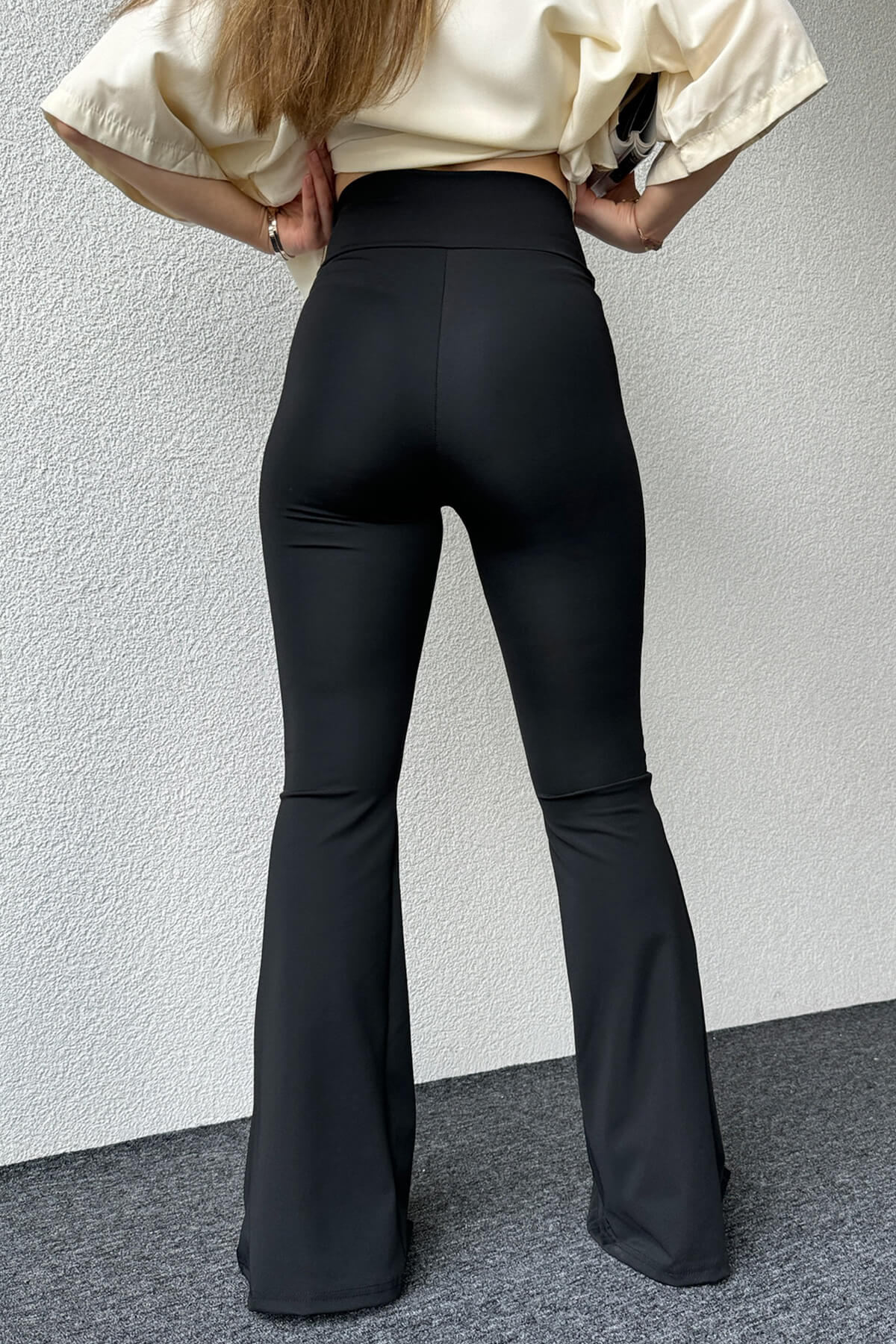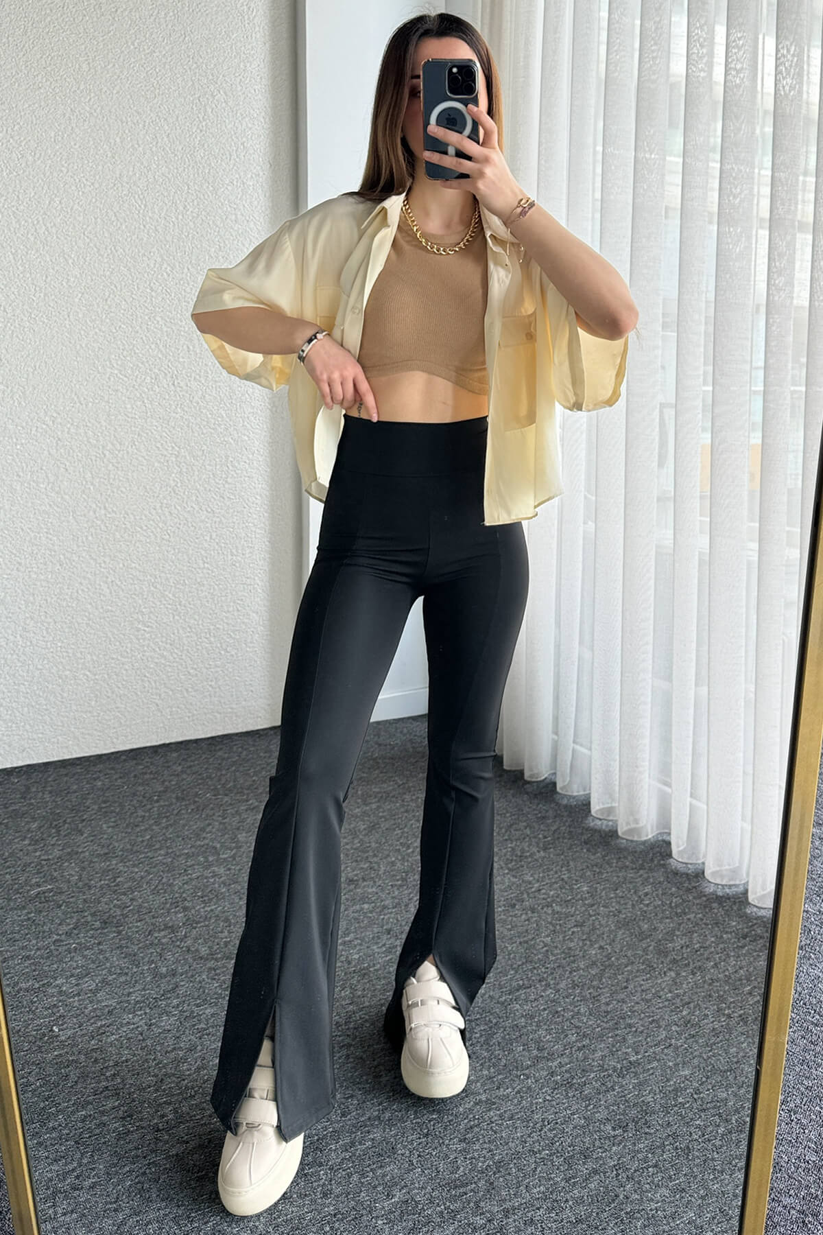 Cappmoda  TYT-15039 Siyah Yırtmaç Detay Çimalı Dalgıç Kumaş Yüksek Bel İspanyol Paça Tayt