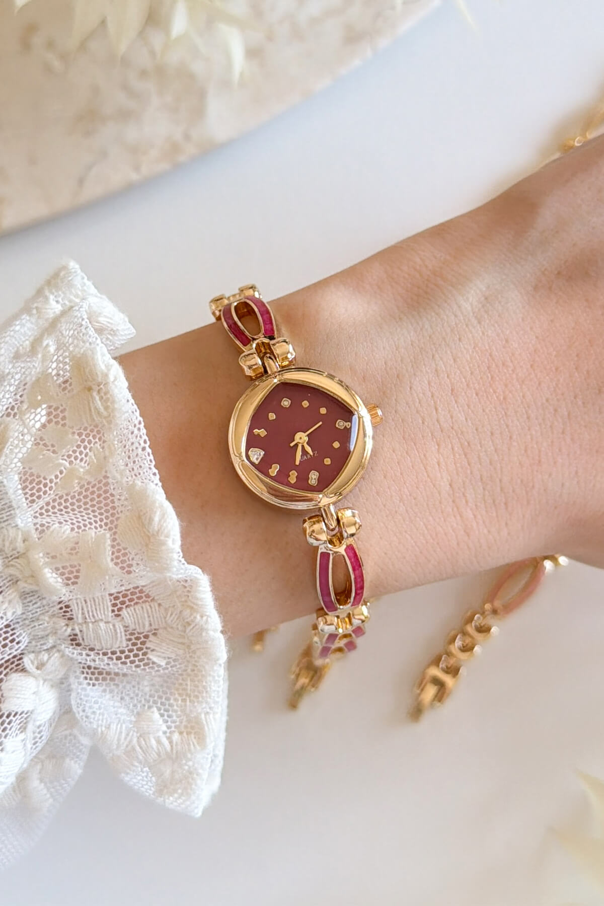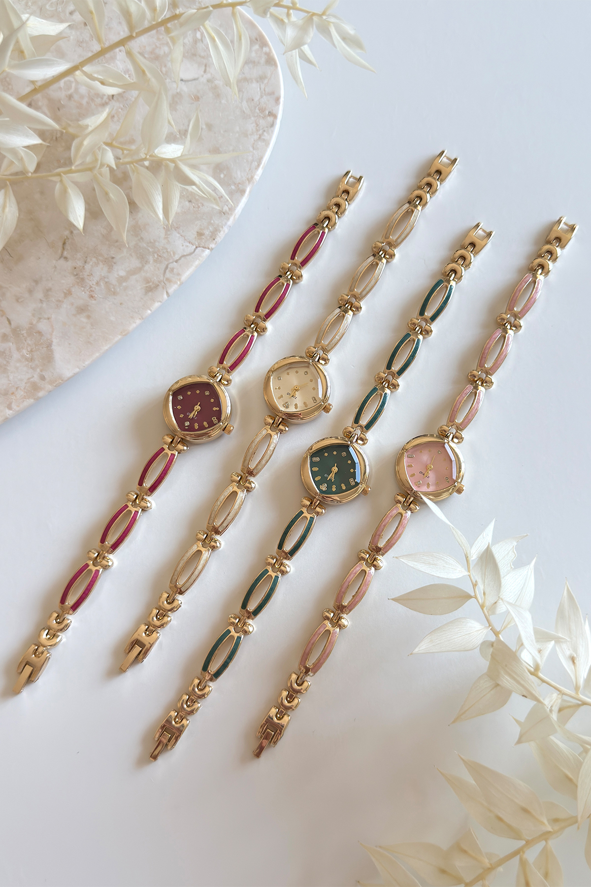 Aksesuar dünyasında zarafetin yeni tanımıyla tanışın. Sadece bir saat değil, bileğinizde bir mücevher gibi parlayacak bu özel tasarım, ince zincir formundaki kordonuyla dikkat çekiyor. Kordon üzerindeki renkli mine geçişleri, kadran rengiyle kusursuz bir uyum yakalayarak bütünsel bir şıklık sunuyor. Bordo, zümrüt yeşili, pudra ve klasik gold seçenekleriyle stilinize sofistike bir dokunuş katın.
