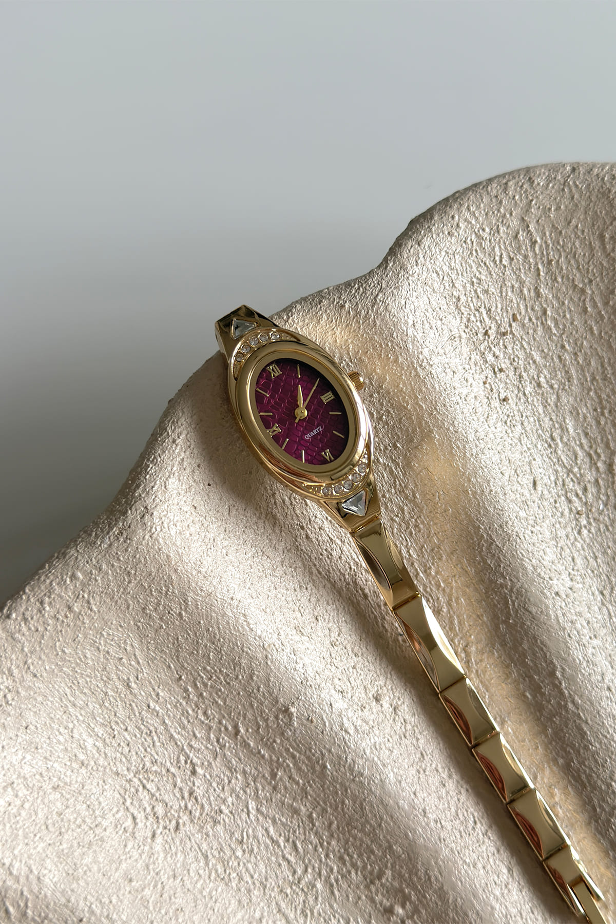 Zarafetin en ikonik formlarından biri olan oval kasa, bu koleksiyonda benzersiz bir dokuyla buluşuyor. Kadranındaki yılan derisi (snakeskin) deseniyle vahşi bir şıklık sunarken, kasa kenarlarındaki kristal taşlarla klasik bir asalet sergiliyor. Bileğinizde bir saatten çok, geçmişin asaletini taşıyan bir mücevher gibi parlayacak.