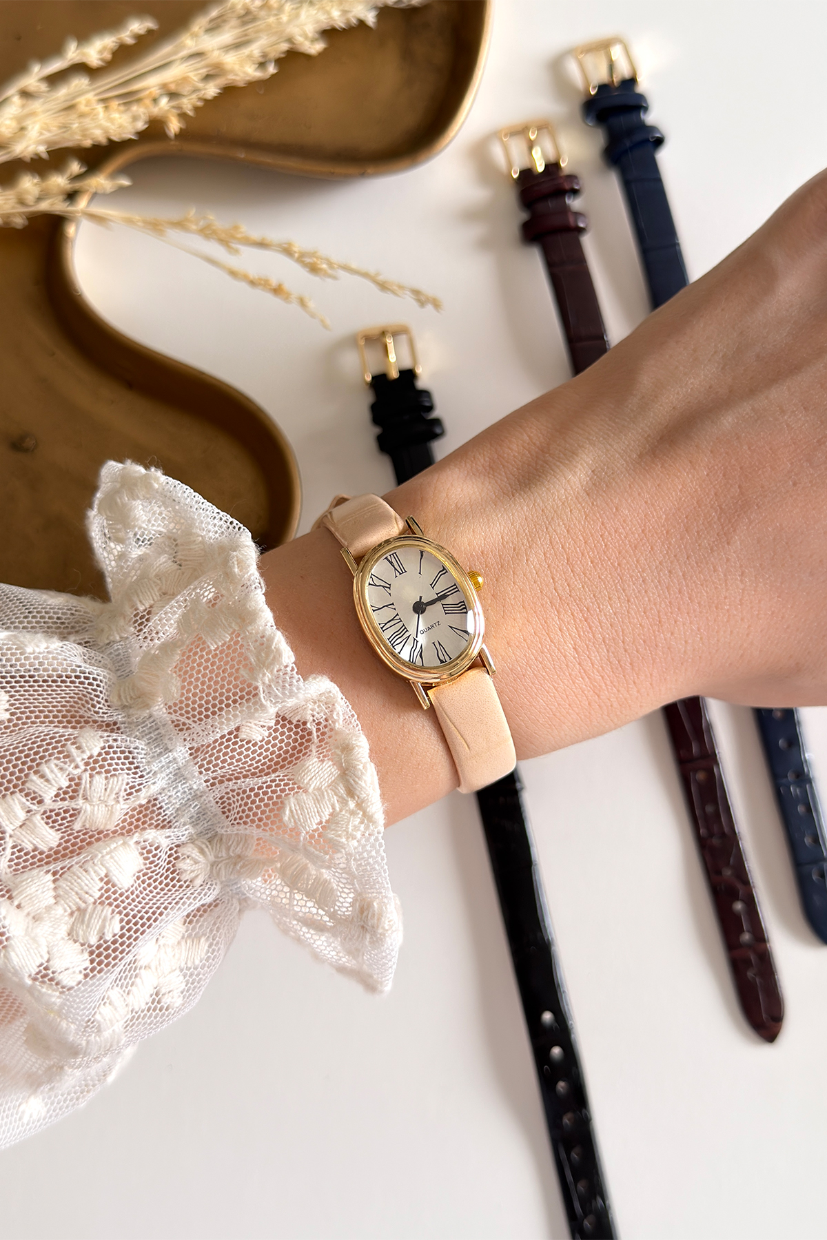 Geçmişin estetik değerlerini modern bir zarafetle buluşturun. Küçük oval kasa tasarımı ve nostaljik Romen rakamlı kadranıyla bu saatler, bileğinizde adeta bir mücevher gibi parlayacak. Vintage Chic stilinin en saf halini yansıtan ince kroko desenli deri kordonu; bej, kahverengi, lacivert ve siyah seçenekleriyle her kombine klasik bir imza dokunuşu katıyor. Zarif ve ince detayları sevenler için tasarlandı.
