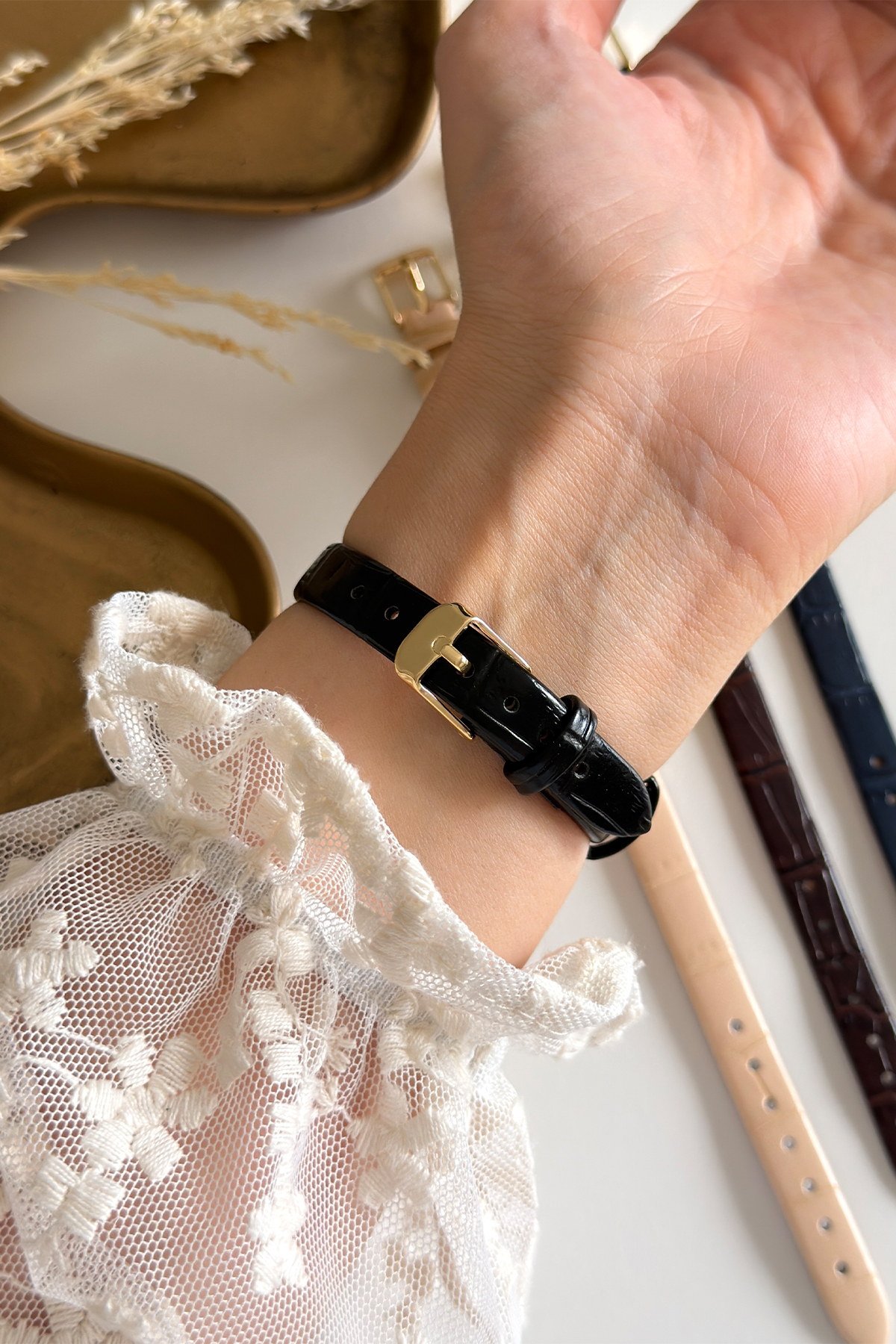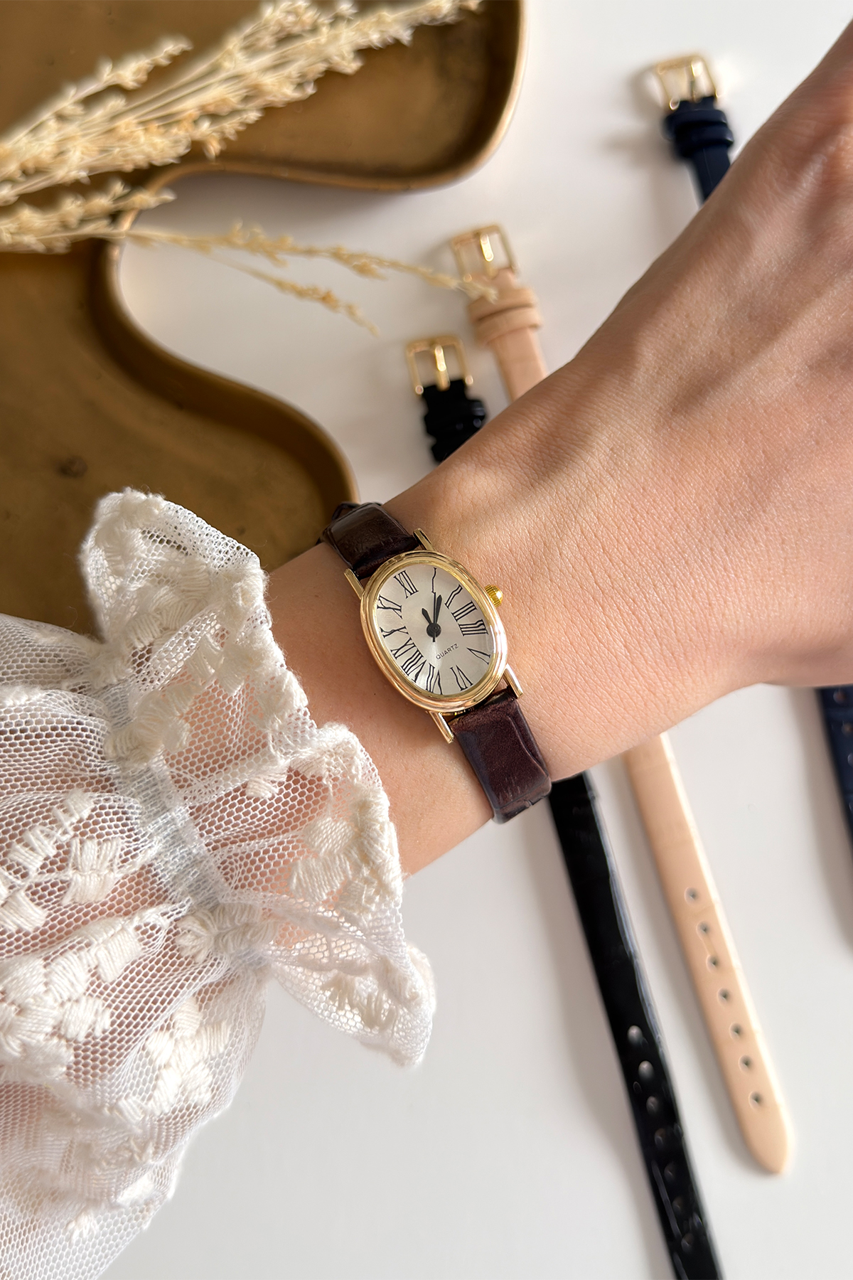 Geçmişin estetik değerlerini modern bir zarafetle buluşturun. Küçük oval kasa tasarımı ve nostaljik Romen rakamlı kadranıyla bu saatler, bileğinizde adeta bir mücevher gibi parlayacak. Vintage Chic stilinin en saf halini yansıtan ince kroko desenli deri kordonu; bej, kahverengi, lacivert ve siyah seçenekleriyle her kombine klasik bir imza dokunuşu katıyor. Zarif ve ince detayları sevenler için tasarlandı.