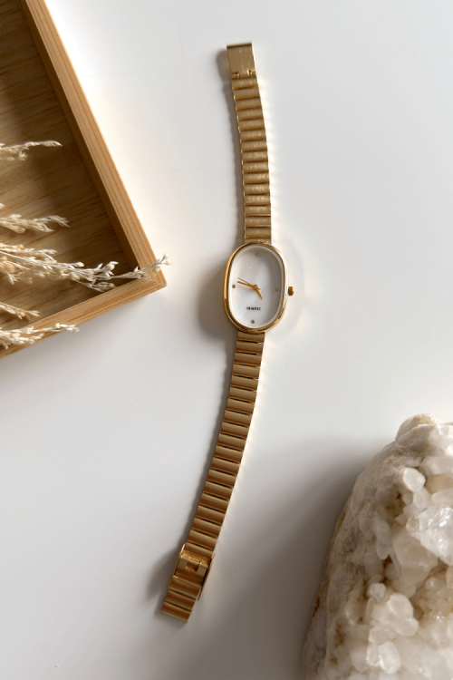 Zoe, retro modasının en sevilen formu olan yatay oval kasayı modern bir minimalistlikle buluşturuyor. Gold rengin sıcak ışıltısı ve kadranın sadeliği, özel tasarımlı yatay baklalı kordon ile birleşerek bileğinizde zarif bir bütünlük sağlıyor. Geçmişin zarafetini günümüzün dinamizmiyle harmanlayan bu model, hem günlük stilinize hem de ofis şıklığınıza sofistike bir dokunuş katmak için ideal.